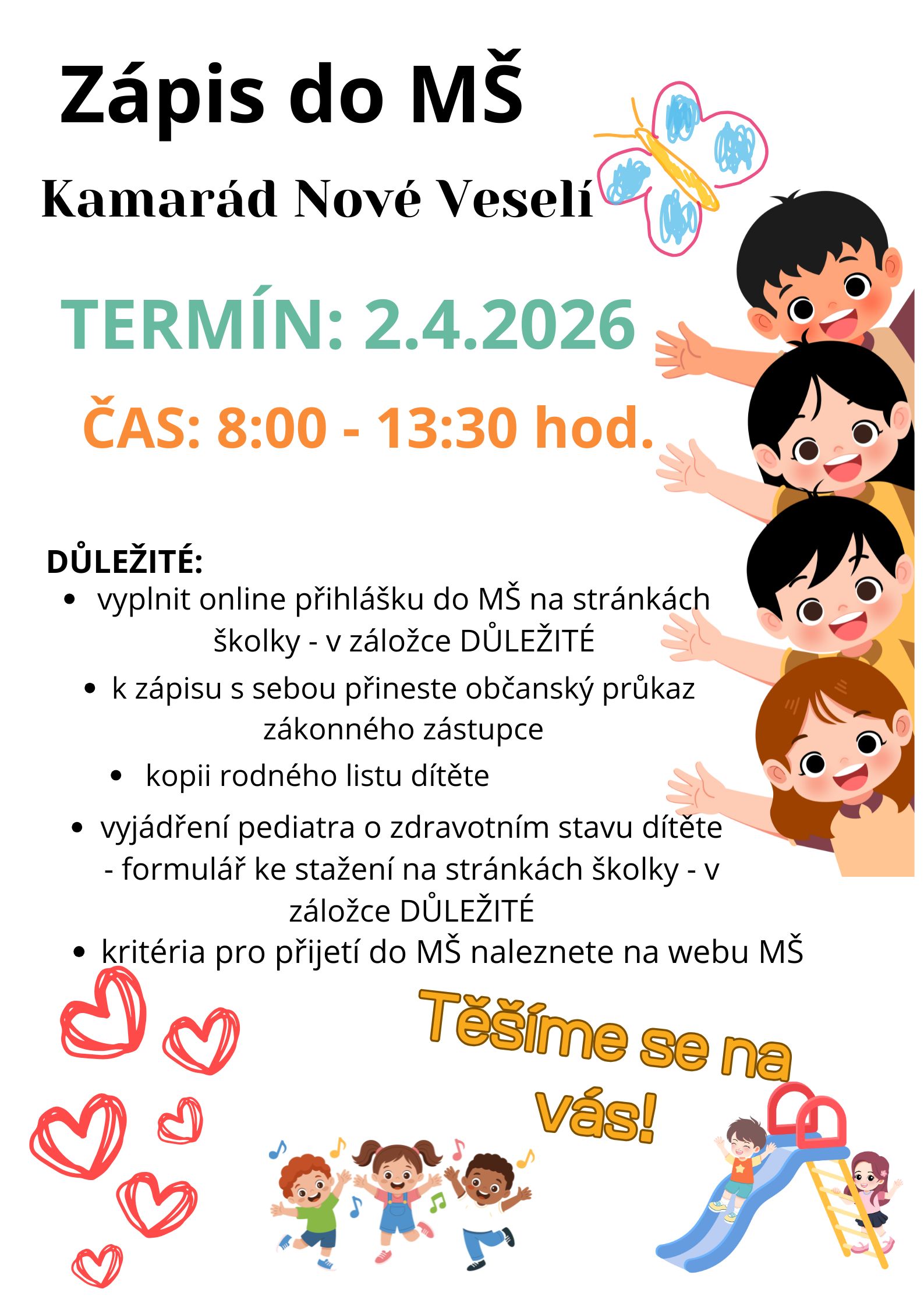 Zápis do MŠ bude probíhat ve čtvrtek 2.4. od 8:00 h ve třídě Koťátek. Více informací naleznete na přiloženém plakátku.